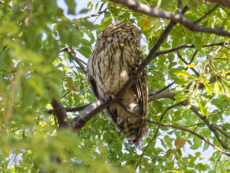 フクロウはほとんど動きませんでしたが、カラスが近づいて来ると時々薄目を開けて首を回していました。