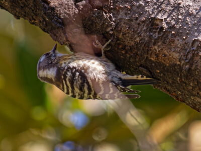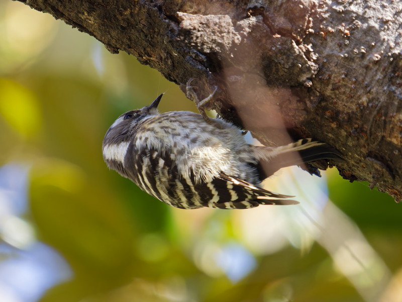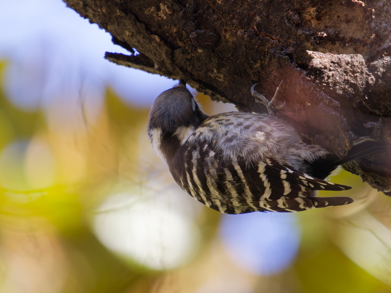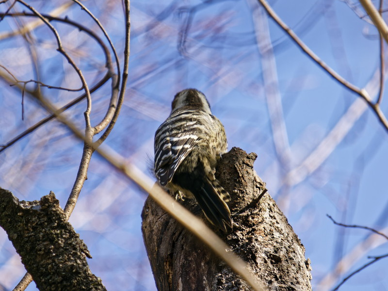 ・所感:白黒の小型のキツツキでチョコチョコ動き回ります。コンコンというドラミングの音が響き、居場所がわかります。木の高い枝に止まっており、なかなか顔が見えませんでした。